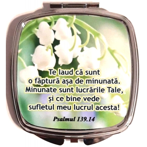 Oglinda pentru poseta din metal, dubla cu imprimeu mesaj crestin
